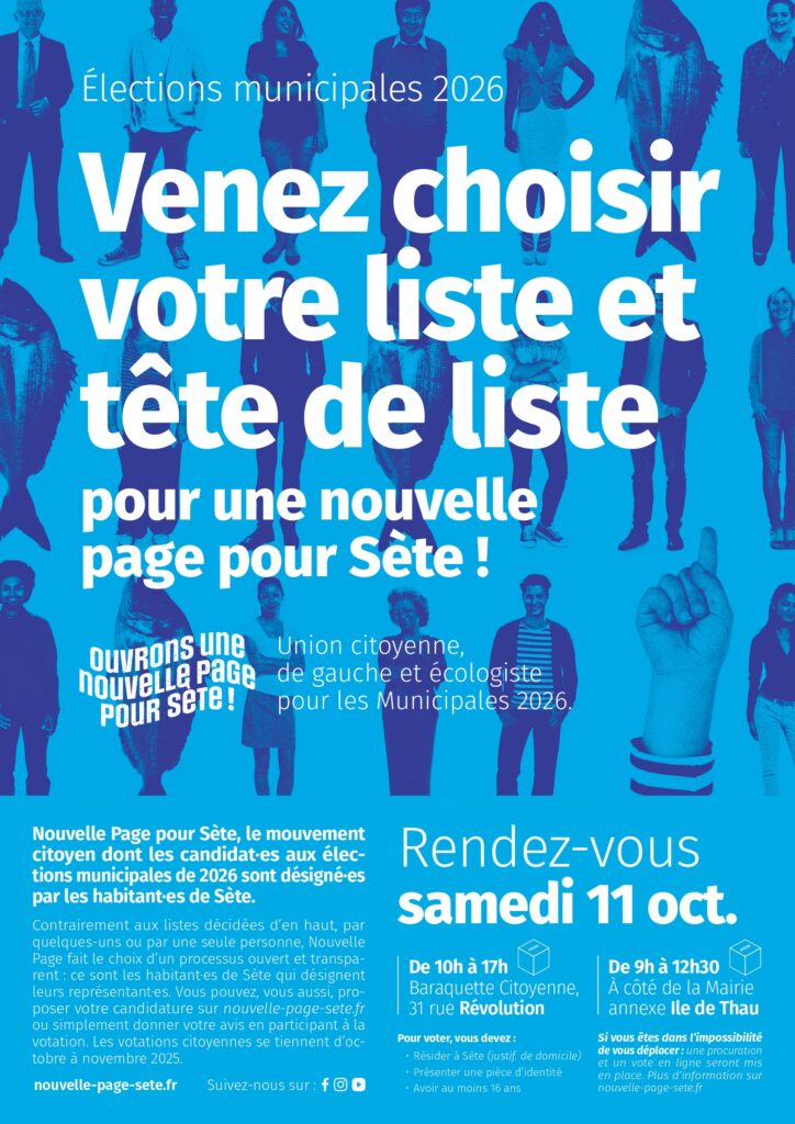 Lors des élections municipales de 2026, notre ville sera à la croisée des chemins. Doublement menacée par le maintien de l’équipe municipale actuelle et par l’extrême droite qui surfe sur le mécontentement pour espérer faire main basse sur la ville. Nous partageons cet espoir que l’ensemble des Sétois.es se réapproprient leur ville et son devenir.